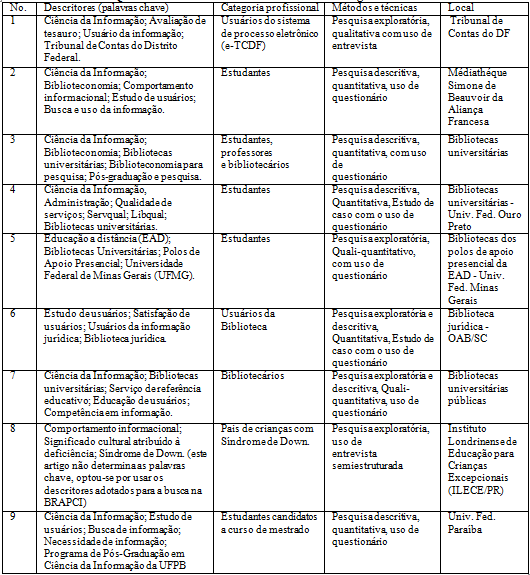 Trinta e quatro artigos foram recuperados. Vinte e cinco desses foram descartados por se tratarem de artigos de revisão ou conceituais ou de pesquisas em andamento, não atendendo, portanto, ao critério de inclusão. Os nove artigos restantes foram analisados por terem se caracterizado como estudos empíricos de usuários da informação, como mostra o Quadro 1.