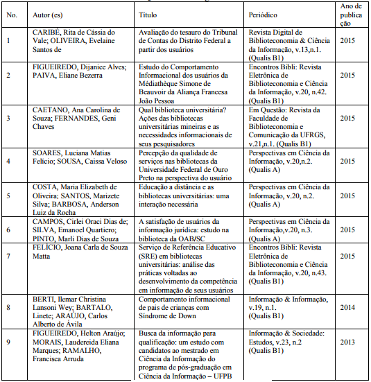 Como pode ser percebido pelo Quadro 1, houve uma maior concentração de artigos descrevendo pesquisas empíricas com usuários no ano de 2015. Os resultados da análise dos artigos que atenderam aos critérios estabelecidos no protocolo desta revisão não permitem definir a existência de uma linha editorial destinada a esta temática entre os periódicos da área, embora a revista Perspectivas em Ciência da Informação tenha publicado três dos nove artigos, e a Encontros Bibli: Revista Eletrônica de Biblioteconomia e Ciência da Informação, dois.