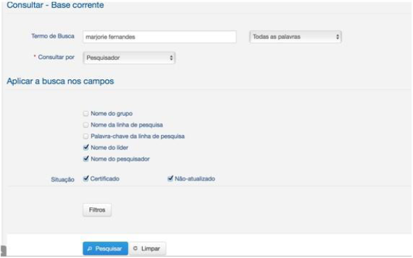 Nesse conjunto, destaca-se que foram observados um total de 20 grupos com liderança de dois pesquisadores e 18 grupos com líderes individuais. Ressalta-se que, para criação dos grupos, é necessária a inclusão de, no mínimo, três pesquisadores da instituição com doutorado, para que seja preenchido o formulário de solicitação disponibilizado pelo CNPq à instituição, para a abertura de grupos. É importante apontar que buscou-se apresentar a produção científica não apenas dos líderes dos grupos no GT3 do ENANCIB, mas também de qualquer outro membro integrante dos grupos analisados. A pesquisa sobre o nome dos pesquisadores autores deu-se por intermédio da aba “consultas-base corrente” no diretório do CNPq, consultando, diretamente, pelo nome do pesquisador no termo de busca. A busca foi aplicada nos campos de líder e pesquisador, e nenhum tipo de filtro foi aplicado, conforme é possível visualizar na figura 1.