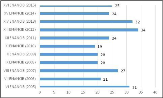 Os trabalhos apresentados no GT3 compreenderam um total de 277 (Gráfico 3), observando-se os anais das seguintes edições: VI (2005), VII (2006), VIII (2007), IX (2008), X (2009), XI (2010), XII (2011), XIII (2012), XIV (2013), XV (2014) e XVI (2015).