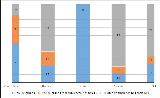 Os dados apresentados no gráfico 5 demonstram que, apesar de haver maior número de grupos sobre mediação na região Nordeste, na publicação de trabalhos no GT3 prevalece, quantitativamente, a região Sudeste. Esse dado reflete a pesquisa em CI, nessa região, que é histórica na criação de cursos de graduação e pós-graduação na área da CI e da Biblioteconomia e cuja experiência reflete-se nas pesquisas desenvolvidas em cursos que correspondem a mais da metade dos grupos mais antigos observados nesse estudo, como também apontados por Oliveira (2009).