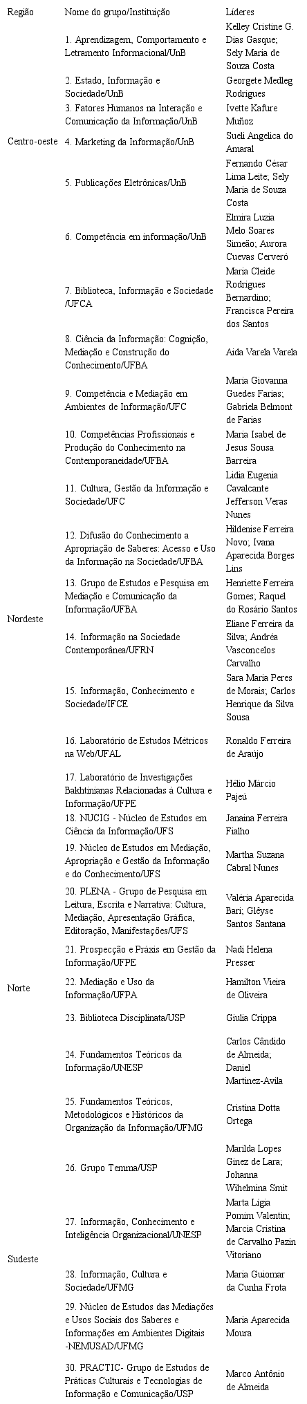 Esses grupos com temas de pesquisa voltados para mediação situam os primeiros movimentos de pesquisa sobre o tema a partir da década de 1990, que também corresponde às mudanças paradigmáticas na área, com reflexos em estudos que se voltam para as questões que focalizam os atores do processo de mediação e as interfaces estabelecidas entre eles e os demais elementos que compõem esse processo. São eles: os ambientes, a comunicação, a significação, os suportes e fontes, e os dispositivos, assim como destacados por Gomes (2010), quando identificou em seu estudo, temáticas convergentes nas publicações do GT3 de 2008 e 2009, e também nas publicações de cinco periódicos da área nesse mesmo período. A totalidade dos grupos analisados, por região brasileira, pode ser visualizada no quadro 1: