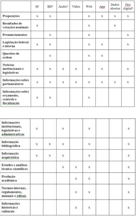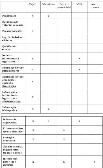 Ao avaliar a gestão da informação no órgão, Alarcão (2011) identificou como principais fontes de informação legislativas: proposições, discursos, legislação, registros em áudio e vídeo oriundos das gravações da TV e da Rádio, informações biográficas e do mandato parlamentar, informações das atividades de controle e fiscalização, incluindo informações de CPI e registros e documentos referentes às atividades legislativas que constam nas publicações oficiais do órgão. Tais fontes estão entre as listadas na primeira coluna do quadro 1 e foram analisadas conforme o tipo de informação, suporte e meio em que se encontram, compondo grande parte da ecologia informacional da Câmara dos Deputados. Além da informação legislativa, destacam-se, também, outras informações que fazem parte da ecologia informacional do órgão, como informações bibliográficas, administrativas, produção acadêmica e outras. O quadro 1 apresenta as fontes e tipos de informação da ecologia informacional da Câmara dos Deputados e identifica os suportes analógicos que os contém.