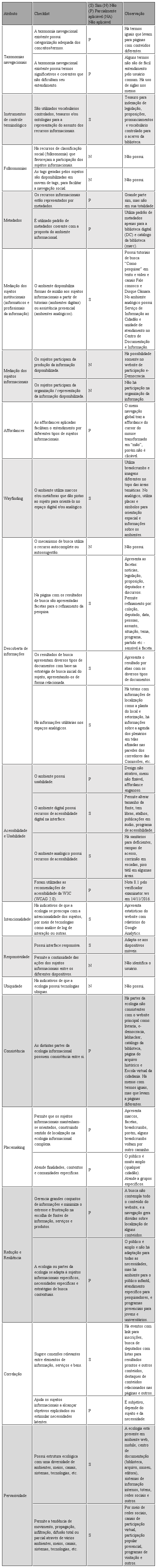 A ecologia informacional da Câmara dos Deputados foi avaliada a partir do checklist de avaliação de ambientes digitais híbridos, proposto por Vechiato, Oliveira e Vidotti (2016). No quadro 3, a seguir, apresenta-se o resultado dessa avaliação.