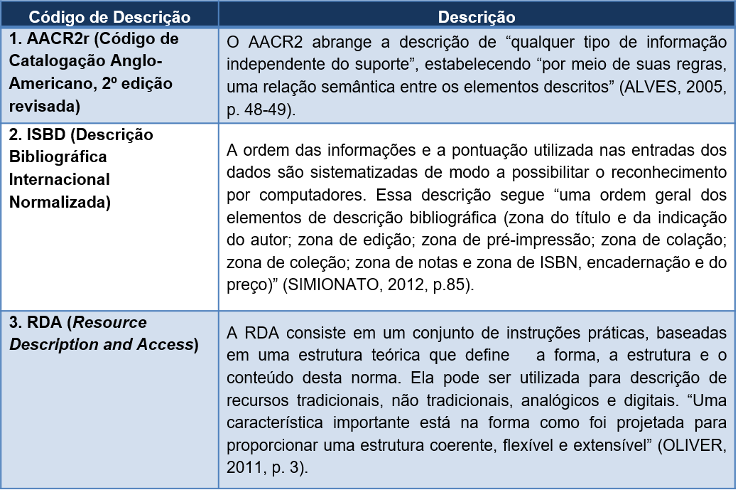 Pode-se dizer que a representação descritiva abrange formas de descrição e de representação de recursos informacionais em ambientes informacionais (convencionais ou digitais), sendo que os códigos de catalogação nada mais são que instrumentos utilizados pelos catalogadores no processo de representação, os quais realizam a codificação dos dados bibliográficos do recurso informacional. Os códigos de catalogação fornecem diretrizes e regras para a descrição de recursos informacionais e para a construção de formas de representação que possibilitam o acesso aos documentos e às informações.