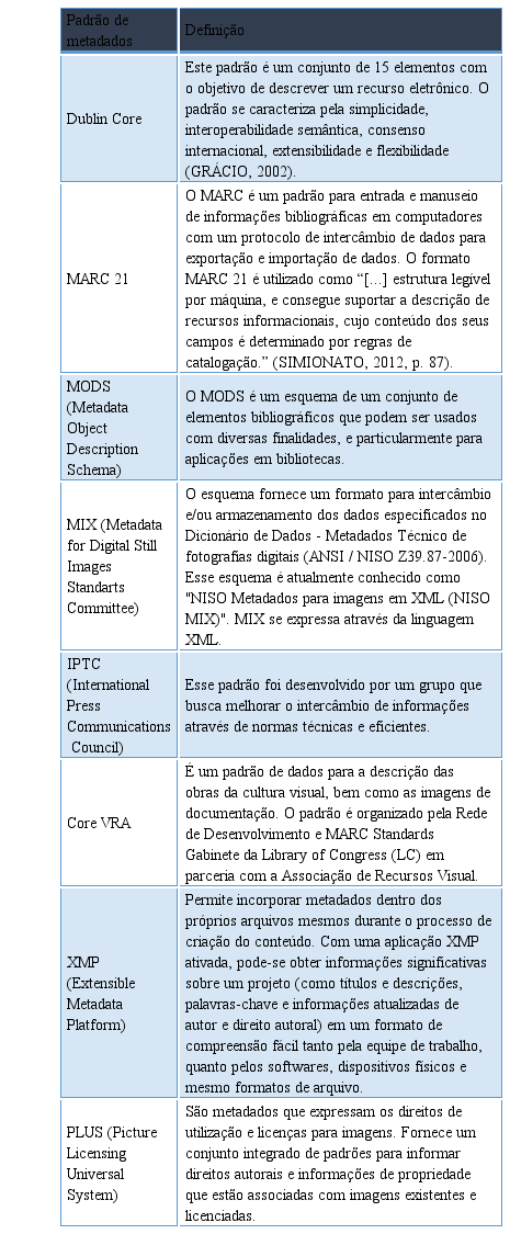 Destaca-se que este estudo foi embasado no mapeamento e na categorização dos padrões de metadados propostos por Simionato (2012) e vale ressaltar que além dos padrões: Dublin Core, MARC21, MODS (LIBRARY OF CONGRESS, 2017), MIX (LIBRARY OF CONGRESS, 2015), IPTC (c2017), Core VRA ([201-]), levantados pela autora, foram identificados mais dois padrões de metadados para a descrição de imagens digitais, os quais são: o PLUS (PHOTO METADATA, [201-]) e o XMP (ADOBE SYSTEMS, c2017), conforme o Quadro 2.