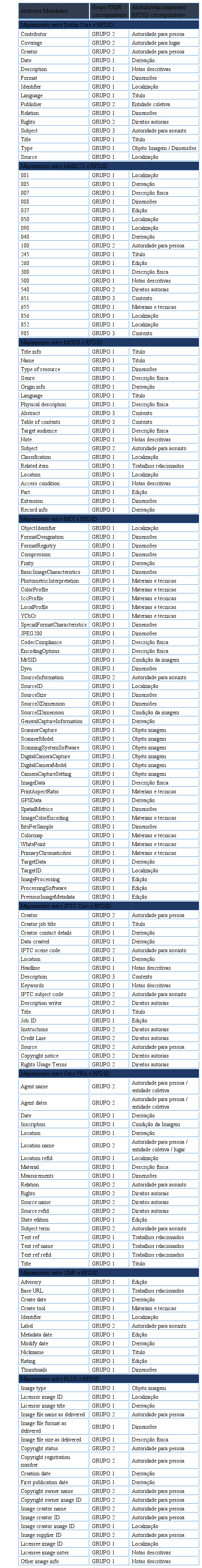 A partir do mapeamento dos padrões de metadados, observou-se que os padrões MIX, Core VRA, XMP e PLUS não apresentam metadados que abrangem o Grupo 3 dos FRBR, no qual encontram-se as entidades que representam o assunto e o conteúdo das imagens digitais, priorizando as entidades do Grupo 1 e 2, nos quais encontram-se as entidades que representam os produtos do trabalho intelectual ou artístico e as entidades que representam os responsáveis pelo conteúdo da obra, respectivamente.