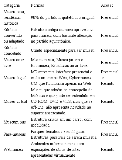 A existência simultânea de museus tradicionais/concretos e museus em ambientes virtuais é marca do cenário artístico-cultural contemporâneo. Apesar da aproximação entre eles, no que permeia suas funções museológicas de preservar e de disponibilizar conteúdos informacionais, no campo das artes, o distanciamento arquitetônico e de acesso físico/presencial é latente. Baseado nos tipos arquitetônicos de museus descritos por Oliveira (2007), apresentamos, no Quadro 2, suas categorias, formas e tipos de acesso. Vale ressaltar que no ciberespaço, assim como nas arquiteturas tradicionais também existe uma arquitetura que se distingue entre si, entre modelos e formas.