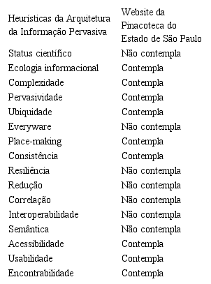 O website da Pinacoteca atende à sua finalidade, que é expor para a sociedade à herança cultural de um determinado contexto, nesse caso, a arte brasileira do século XIX, mantendo certa consistência contextual em seu acervo. Dentre as heurísticas analisadas, as quais o website analisado não contempla, estão a Resiliência, a Redução, a Correlação, a Interoperabilidade e a Semântica. Por outro lado, o site ainda permite que se tenha uma boa Acessibilidade, pois os ícones de acesso às paginas e às informações estão bem organizados, de forma que o usuário se sinta seguro e autônomo para navegar - Usabilidade. A Encontrabilidade também está presente no website da Pinacoteca, visto que o site apresenta mecanismos de busca eficientes que atendem às necessidades de recuperação da informação no ambiente específico de arte por meio dos nomes dos artistas.