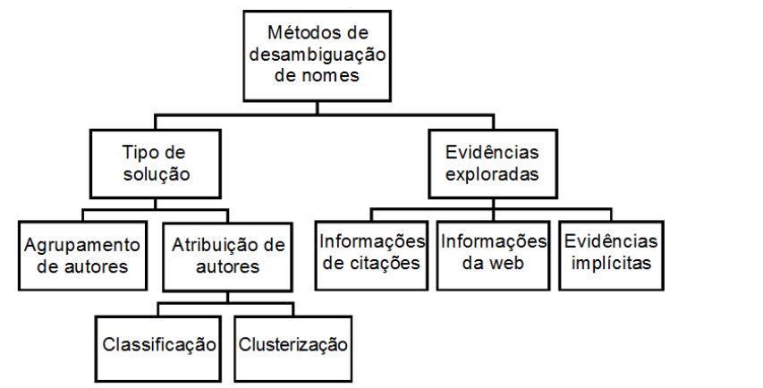 Ferreira, Gonçalves e Laender (2012) propuseram uma taxonomia para descrever as estratégias utilizadas na desambiguação de nomes de autores (figura 1). A taxonomia proposta organiza as estratégias em duas características principais: o tipo de estratégia e as evidências exploradas.