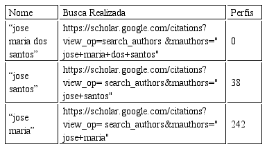 Busca por pesquisadores no Google Acadêmico: consiste em, dado o nome completo de um docente da amostra, utilizar a ferramenta de busca por perfis, disponibilizada de maneira online pelo sistema (GOOGLE, 2004b), e armazenar as respostas obtidas. Para isto, inicialmente, é feita a busca pelo nome completo do autor entre aspas e removem-se do nome do autor os acentos e os sinais de pontuação como hifens ou apóstrofes. Se esta consulta retornar um ou mais resultados, estes são armazenados e utilizados nas próximas etapas de processamento. Caso nenhum resultado seja retornado, uma nova consulta é executada. Se ainda assim, nenhum resultado for retornado, uma última consulta adicional é executada, e seus resultados são armazenados. A primeira consulta adicional consiste da busca pelo primeiro e último nome do autor (em vez do nome completo), já a segunda, consiste na busca pelo primeiro e penúltimo nome do autor. Apenas para ilustrar, dado um docente hipotético cujo nome é José Maria dos Santos, a busca original seria feita procurando-se “jose maria dos santos”. Caso não retornasse nenhum resultado, isto é, nenhum perfil foi encontrado com esse nome, a primeira busca adicional seria feita procurando-se “jose santos” e a segunda procurando-se “jose maria”. O quadro 1 resume os resultados do exemplo apresentado para a busca do perfil de José Maria dos Santos. Destaca-se que todas as consultas à ferramenta do Google Acadêmico podem retornar zero, um ou múltiplos perfis. Estes resultados são tratados nas próximas atividades.