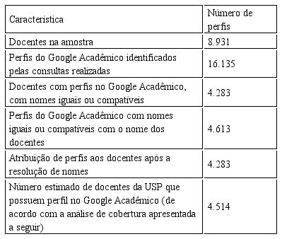 A resolução de nomes propriamente dita, então, atribuiu a cada docente USP o respectivo perfil no Google Acadêmico, desde que o nome no perfil do Google Acadêmico fosse igual ou compatível, e houvesse, ao menos, o casamento de uma publicação entre o perfil no Google e o currículo Lattes do docente. Ao todo, 4.613 perfis satisfizeram esse critério, sendo que 3.152 apresentavam os nomes iguais aos do docente e 1.461 apresentavam os nomes compatíveis. Assim, 4.613 perfis do Google Acadêmico satisfizeram os quesitos de compatibilidade com 4.283 docentes. Para os casos em que mais de um perfil foi considerado igual ou compatível, atribuiu-se ao docente o perfil que apresentava o maior número de casamento de publicações.