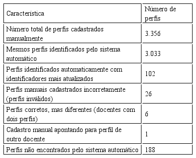 Já 26 (0,9%) dos perfis apresentaram erros em seus identificadores (erro de digitação, por exemplo, durante o cadastro manual) e foram identificados, corretamente, pelo sistema automático. Por outro lado, 6 (0,2%) docentes apresentaram dois perfis no Google Acadêmico, e o sistema automático indicou um perfil diferente daquele cadastrado manualmente. Por fim, havia um único registro, cujo cadastro manual apontava para o perfil de outro docente e que o sistema automático foi capaz de identificar o perfil correto. O quadro 3 sumariza essa comparação.