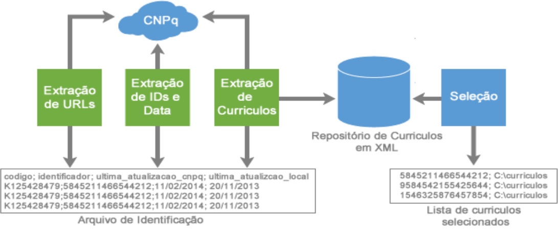 O processo de extração do LattesDataXplorer para obtenção dos currículos foi realizado em três etapas: (1) extração de URLs, responsável por adquirir as referências únicas para os currículos cadastrados e, assim, possibilitar o acesso individual a cada currículo; (2) extração de Ids, para possibilitar o acesso a cada currículo e extrair seu identificador e; (3) extração dos currículos, responsável pelo download e armazenamento em disco dos arquivos no formato XML (eXtensible Markup Language) (DIAS, 2016).