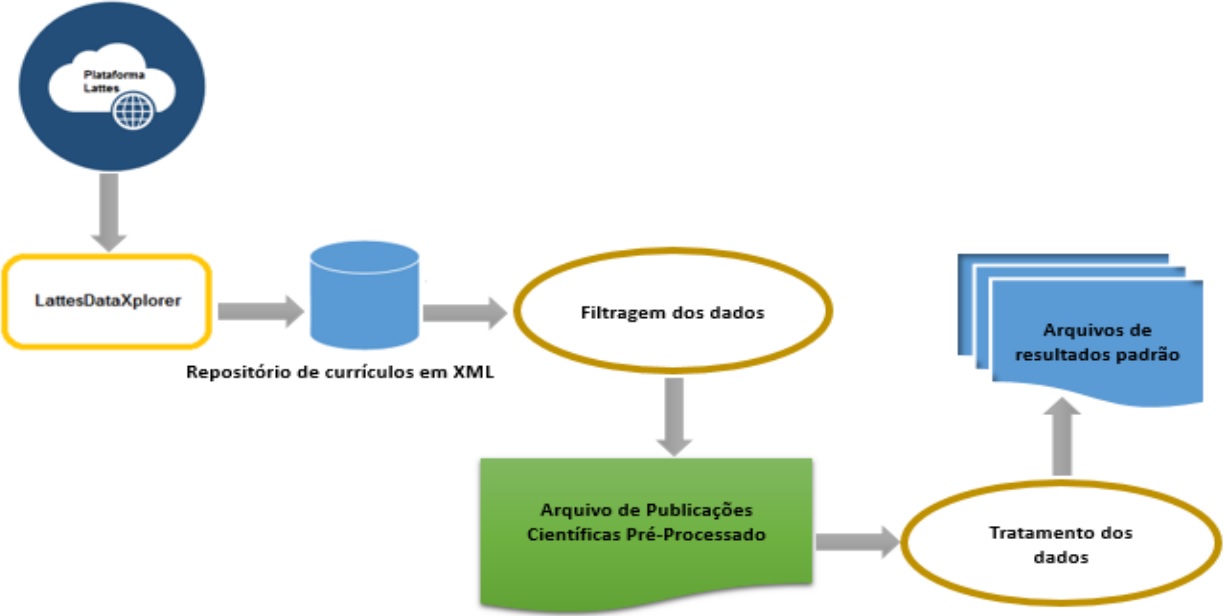A obtenção dos dados ocorreu em abril de 2017, totalizando 265.170 currículos de doutores. Para tanto, foi utilizado o LattesDataXplorer, proposto por Dias (2016), para coletar os dados existentes no repositório da Plataforma Lattes, como ilustrado na Figura 1.