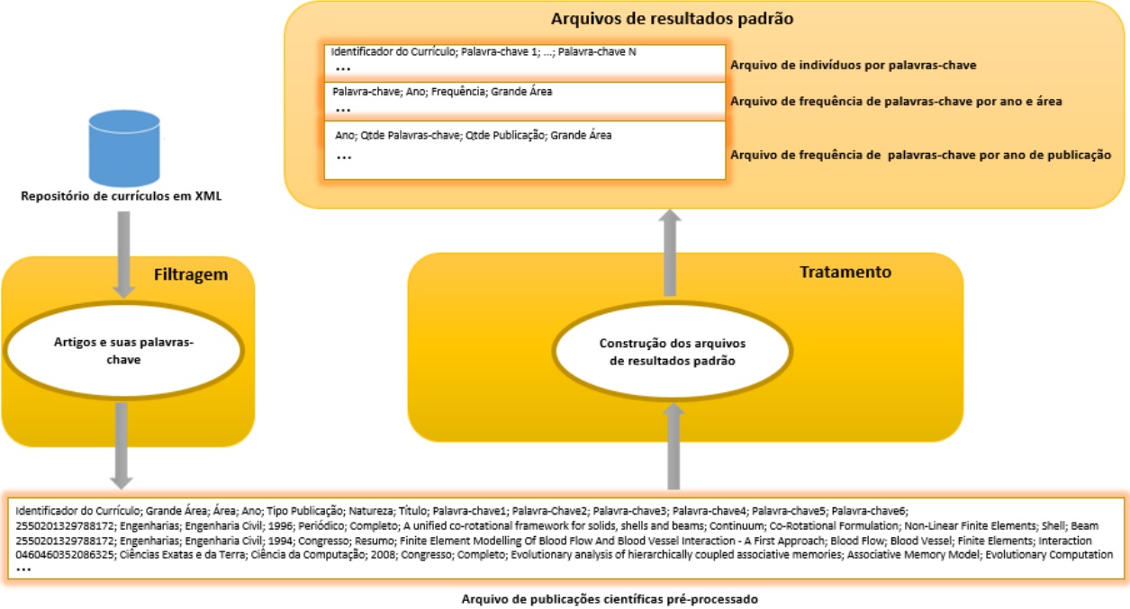 Após a aquisição dos currículos, o componente de “filtragem dos dados” realiza a etapa de mineração nos arquivos XML para extrair as informações dos artigos, armazenando-as em um arquivo de publicações científicas e, com isso, definindo o conjunto de dados centrais a serem processados. As informações dos artigos incluem: identificador do currículo; grande área da publicação; ano de publicação; tipo de publicação; título e palavras-chave.