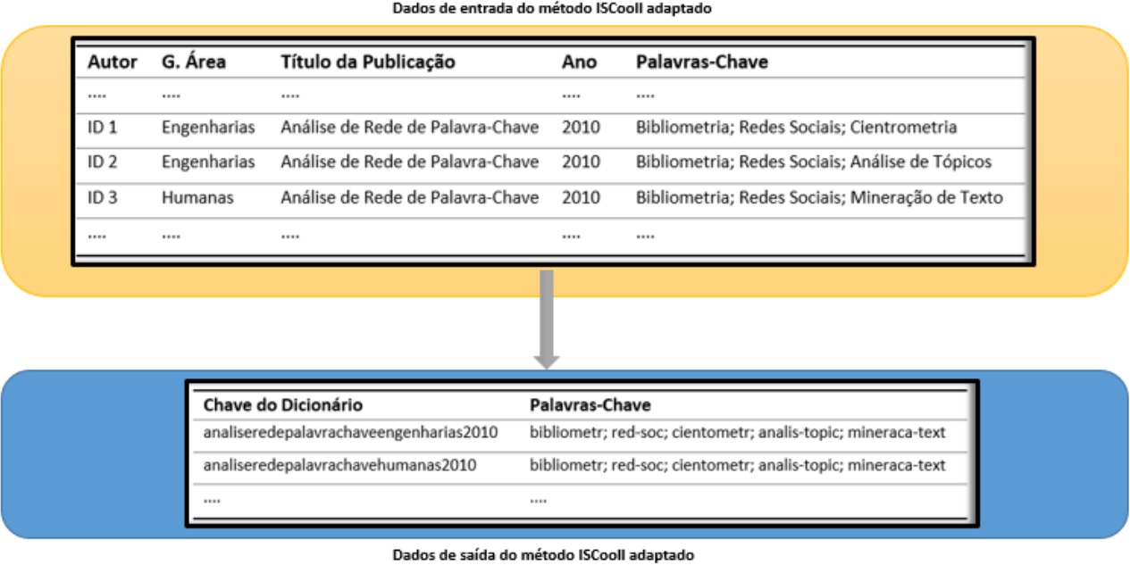 Sendo assim, a etapa de normalização dos dados tem o objetivo de analisar os artigos para eliminar as inconsistências citadas. Para tanto, fez-se necessário uma adaptação no método ISCooll proposto por Dias e Moita (2015), a fim de identificar colaborações científicas automaticamente em grande volume de dados. Enquanto o método ISCooll original utiliza um dicionário para vincular os artigos (chaves de um dicionário) a seus autores (identificadores dos currículos), o método ISCooll adaptado adota um dicionário para vincular os artigos ao conjunto união das respectivas palavras-chave. Outra diferença é que, enquanto o método ISColl original utiliza o título do artigo concatenado com seu ano de publicação, o método ISCooll adaptado adiciona também a grande área da publicação, ou em caso de inexistência, a primeira grande área de atuação informada no currículo.