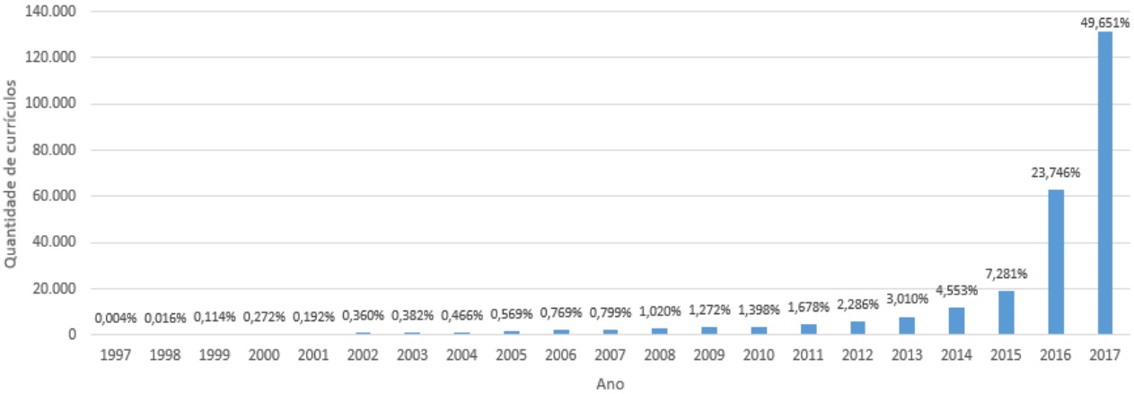 Apesar de existirem 10 currículos com data da última atualização em 1997, essa quantidade é irrelevante perante o conjunto total. De acordo com Dias (2016), a não atualização desses currículos pode ter motivos variados e de difícil reconhecimento. Contudo, a grande maioria foi atualizada recentemente, na qual 49,651% dos currículos (131.660) apresentam data de última atualização em 2017, e 73,397% (194.626) foram atualizados nos últimos dois anos.