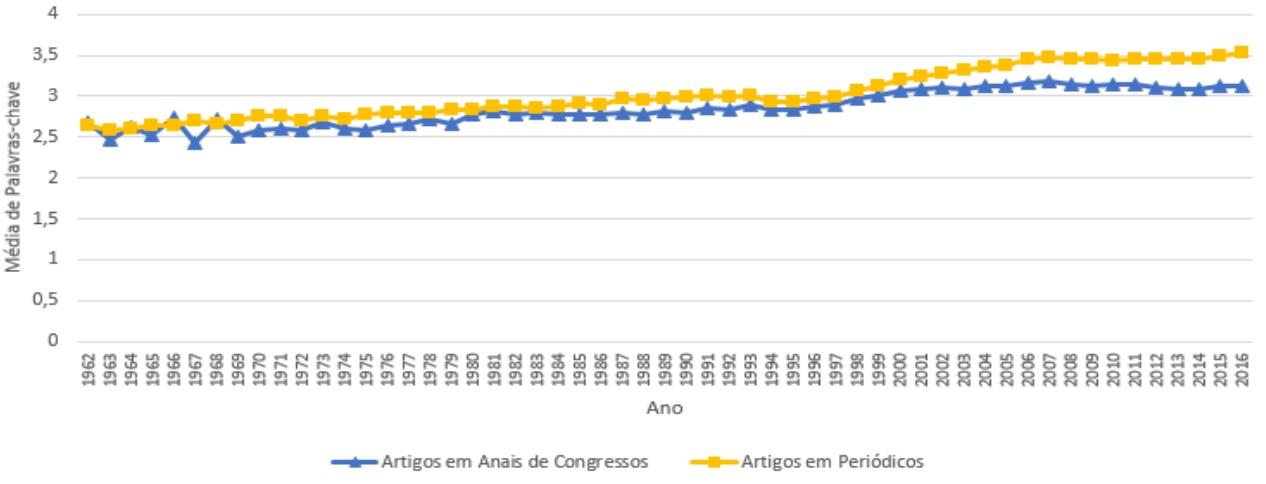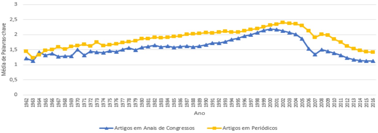 Como pode ser observado, para a maioria dos anos, as curvas das palavras-chave, em anais de congressos e em periódicos, apresentam o mesmo comportamento dos artigos. Outra situação interessante é que, o maior número de palavras-chave não ocorreu no mesmo ano do maior número de artigos. Percebe-se, ainda, que as palavras-chave tiveram um crescimento considerável entre 1995 e 2005: em congressos cresceram 443% e em periódicos, 197%. No entanto, a partir de 2005, houve uma queda de 67% em congressos e 18,9% em periódicos e, consequentemente, após 2014, o número de palavras-chave em periódicos tornou-se maior que em congressos. Em continuação, a Figura 7, construída com base na visão geral, apresenta a média das palavras-chave por artigos ao longo dos anos.