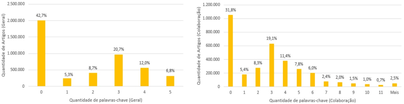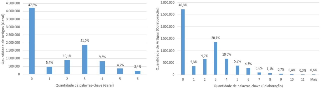 É possível verificar que a média de palavras-chave por artigo de periódico é, geralmente, superior a de congressos. Contudo, o baixo valor de média encontrada é devido à influência dos artigos que apresentam poucas (ou nenhuma) palavra(s)-chave associada(s). Para facilitar essa visualização, os histogramas referentes à distribuição do número de artigos pela quantidade de palavras-chave foram gerados, a partir das visões geral e colaboração (Figuras 8 e 9).