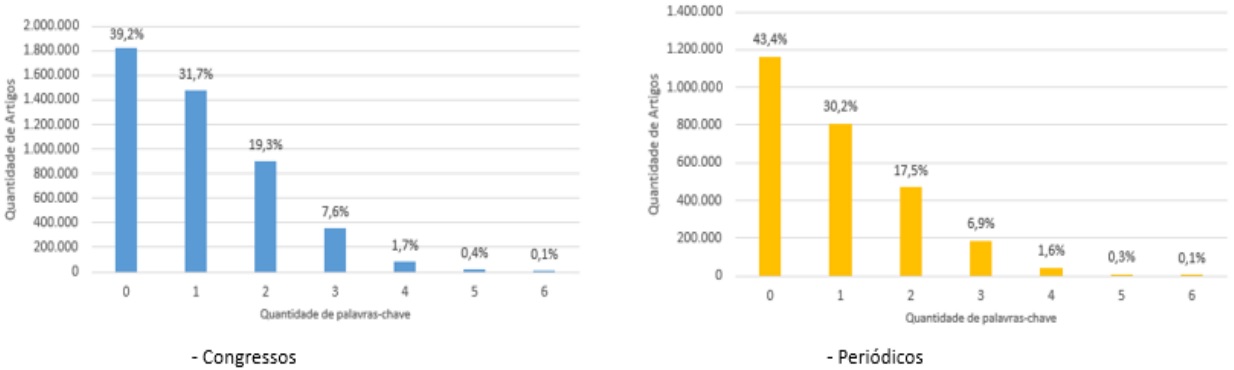 Dessa maneira, é possível verificar que à medida que o número de palavras-chave nos títulos aumenta, o percentual de artigos diminui aceleradamente. Dentre estes, destaca-se o percentual elevado (cerca de 40%) dos artigos que não apresentam palavras-chave no título. Isso fundamenta, ainda mais, a originalidade dos estudos sobre palavras-chave da Plataforma Lattes.