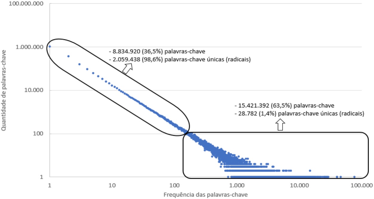 Assim, observa-se que 24.256.312 palavras-chave (conjunto global), após serem processadas, reduziram-se a 2.088.220 (palavras-chave únicas), comprovando a importância das etapas de tratamento dos dados para diminuição das informações a serem manipuladas. Também, nota-se que 63,5% do conjunto global das palavras-chave equivalem a 1,4% do total de palavras-chave únicas de frequência superior a 100, enquanto os 36,5% restantes equivale a 98,6% das palavras-chave únicas que aparecem menos de 100 vezes. Isto confirma uma das leis clássicas da Bibliometria, Lei de Zipf ou Lei do Mínimo Esforço, na qual se descreve que um pequeno número de palavras é usado muito mais frequentemente.