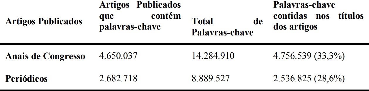 A grande quantidade de palavras-chave cadastradas na Plataforma Lattes pode servir de base para verificar o desenvolvimento da ciência brasileira, uma vez que têm a função de destacar os principais assuntos que permeiam o artigo. Apesar disto, a estratégia de analisar termos extraídos de títulos dos artigos é o foco principal da maioria dos estudos encontrados e, no caso da Plataforma Lattes, é o foco de todos. Embora, esta estratégia tenha utilidade, notadamente, ela apresenta suas limitações, já que nem sempre os títulos conseguem expressar todo o conteúdo de um trabalho.
