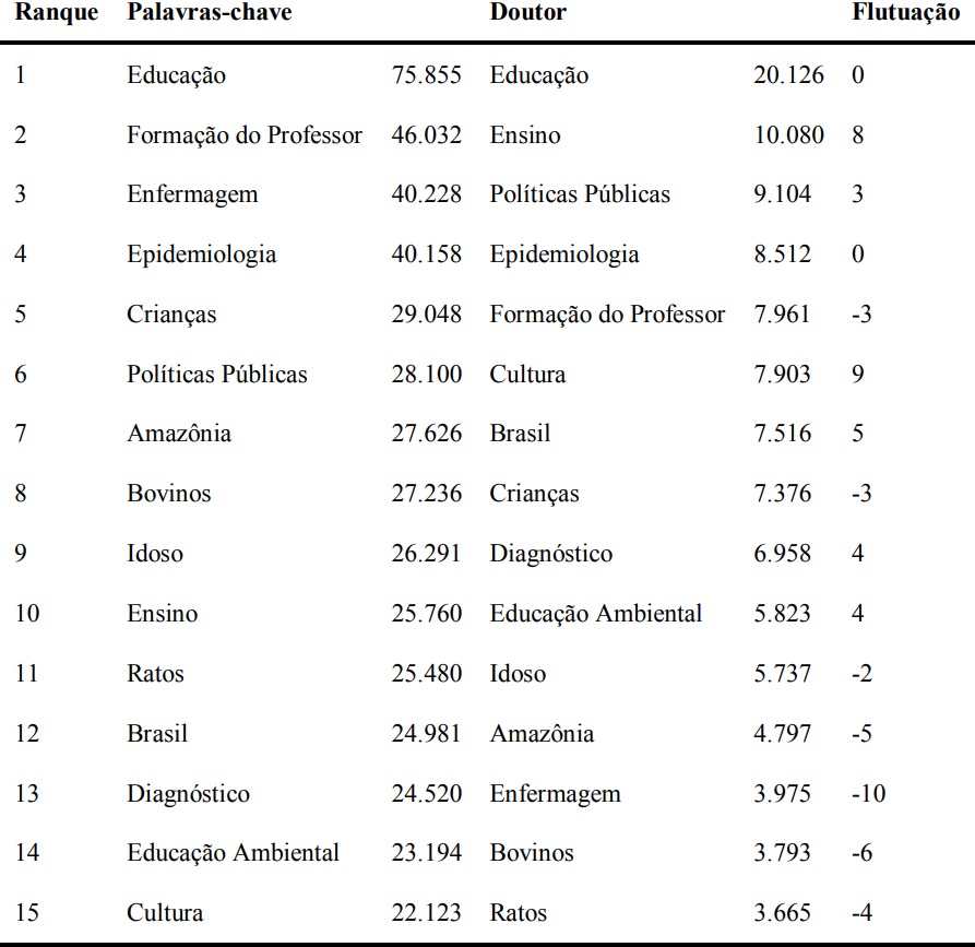 Em continuação, para conhecer os tópicos que se constituem como os principais assuntos de pesquisa, todas as palavras-chave únicas foram ranqueadas de acordo com a medida de importância baseada na frequência. A Tabela 5 apresenta a classificação das principais palavras-chave e, dentre estas, o ranque do quantitativo de doutores envolvidos em cada palavra. A coluna “Flutuação” apresenta o desvio de posição no ranque do número de doutores envolvidos em cada palavra-chave, se comparado ao ranque da frequência.