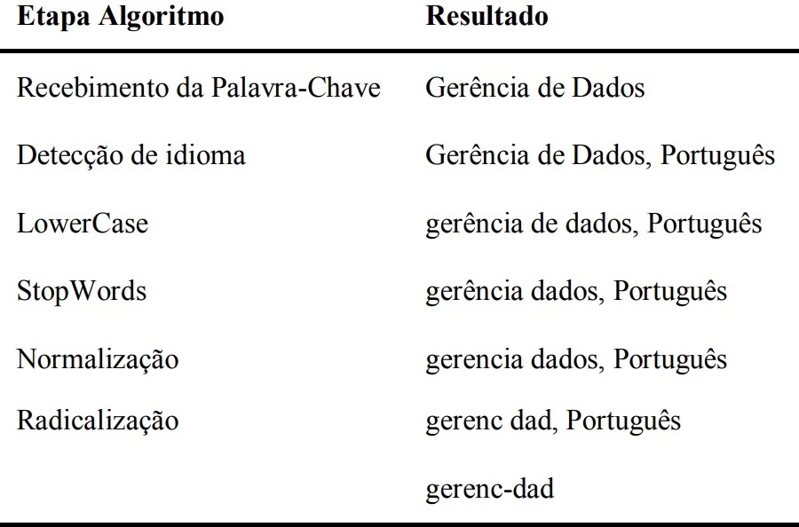 E, por último, o processo de stemming que consiste na redução das palavras-chave a seu radical. O processo de stemming é importante para evitar a inclusão de palavras-chave com o mesmo significado de formas distintas, possibilitando a redução do conjunto de forma significativa. No caso de palavras-chave compostas, este processo é executado em cada termo individualmente e, em seguida, são concatenados formando uma única palavra. A Tabela 1 apresenta um exemplo de transformação de uma palavra-chave de artigo científico, após a execução da etapa de limpeza e agrupamento.