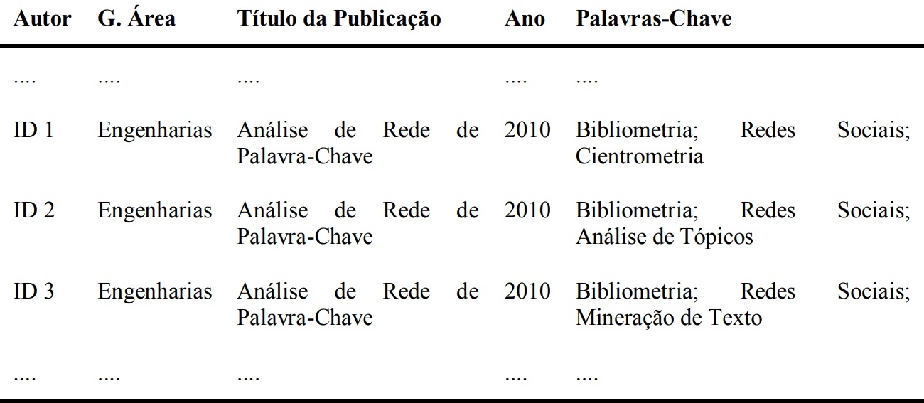 No caso dos currículos cadastrados na Plataforma Lattes, não é uma situação incomum dois pesquisadores cadastrarem um artigo científico que publicaram juntos, utilizando diferentes informações como, por exemplo, as respectivas palavras-chave. Em contrapartida, em determinadas análises, o preenchimento igualitário das informações pode gerar duplicidade de dados quando considerado todo o repositório. Por exemplo, a Tabela 2 exemplifica uma situação que um mesmo artigo aparece três vezes, isso ocorre, pois, tal artigo foi publicado em coautoria. Neste caso, a frequência de cada palavra-chave que aparece igualmente deveria ser um, pois se trata do mesmo artigo publicado. No entanto, para as palavras “Bibliometria” e “Redes Sociais” a frequência é 3.
