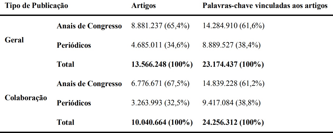 É possível destacar a preferência dos doutores sobre a publicação de artigos em congressos. Como esperado, o total de artigos, na visão colaboração, é cerca de 25% menor que da visão geral, devido ao fato de terem artigos registrados em coautoria. Entretanto, o número total de palavras-chave da visão colaboração é maior que da visão geral, fato este, devido aos autores cadastrarem diferentes palavras-chave e/ou grandes áreas para o mesmo artigo realizado em coautoria.