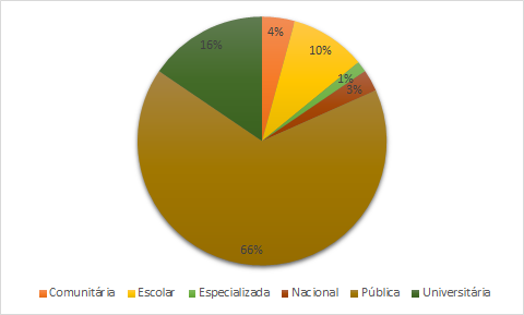 Com a análise, também foi possível identificar as tipologias de bibliotecas. Importante pontuar que mesmo com o termo de busca “biblioteca”, muitas delas não diziam respeito a uma petição que surtisse efeito no espaço, mas sim na profissão. Desta forma, do total do levantamento com 91 petições, 71 eram sobre bibliotecas especificamente, sendo que o Gráfico 1 apresenta suas tipologias: