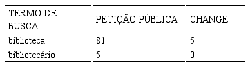 Diante de todas estas possibilidades de ativismo digital e reiterando que há todo tipo de manifestação presente nestes ambientes online, buscou-se investigar a presença dos temas “bibliotecas” e “bibliotecários” nas petições. Ao analisar o grupo no Facebook “Bibliotecários na LUTA!”, Correa e Prado (2015) já puderam perceber que há um envolvimento político da classe profissional propiciado pela Internet. É um exímio resultado do que a revisão de literatura aqui identificou, sendo um movimento de não-violência “[...] que procurou mobilizar bibliotecários para a participação unida, corajosa e democrática na luta pelos direitos de cidadãos e da categoria de forma pacífica e coesa.” (CORREA; PRADO, 2015, p. 39).