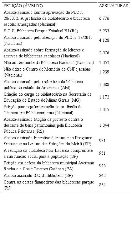 As petições sobre as bibliotecas públicas foram as mais expressivas quantitativamente, compondo 47 documentos da análise (66%). Em seguida, vieram as bibliotecas universitárias, com 11 petições (16%); as escolares com 7 (10%); as comunitárias com 3 (4%); as nacionais com 2 (3%) e uma única para biblioteca especializada (1%). Já no número de assinaturas este ranking é diferenciado. As bibliotecas públicas continuam em primeiro lugar, com 16.985 assinaturas; todavia, as escolares assumem a segunda colocação com 10.508 assinaturas; seguido da nacional com 2.603, as especializadas com 1.939, as universitárias com 1.287 e as comunitárias com 64 assinaturas somente.