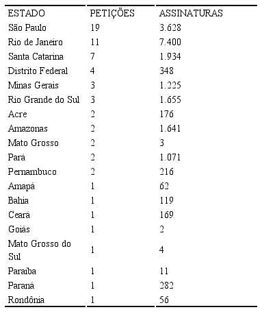 Percebe-se que o número de petições não é determinante para o maior número de assinaturas. No caso do Rio de Janeiro, por exemplo, que teve 8 petições a menos que São Paulo, obteve mais que o dobro do total de assinaturas que este estado (somente a petição “S.O.S. Biblioteca Parque Estadual RJ” recebeu 5.953). Os estados do Espírito Santo, Maranhão, Rio Grande do Norte, Sergipe, Tocantins, Alagoas, Piauí e Roraima não tiveram nenhuma petição.
