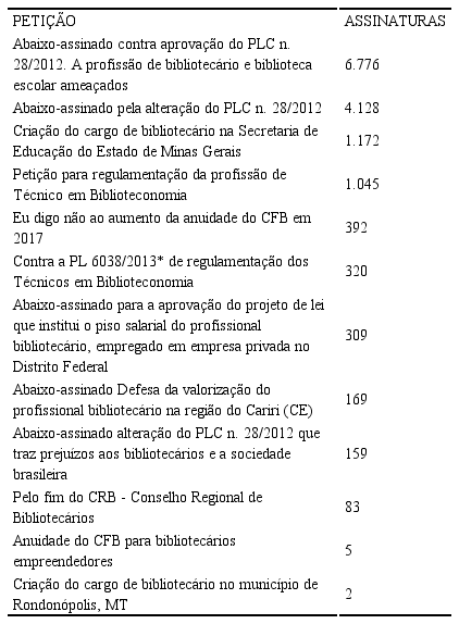 A petição que mais recebeu assinaturas foi o “Abaixo-assinado contra aprovação do PLC n. 28/2012. A profissão de bibliotecário e biblioteca escolar ameaçados”, organizado no site “Petição Pública”. Direcionada para o Senado Federal, ela foi criada para manifestar uma contra aprovação do projeto de lei que visa à exclusão das bibliotecas escolares da rede particular de ensino e da possibilidade de um empregador contratar um bibliotecário para atuar em mais de um estabelecimento. De mesmo teor e também criada dentro do site “Petição Pública”, o Abaixo-assinado pela alteração do PLC n. 28/2012 recebeu uma quantidade de assinaturas suficiente para obter a terceira posição na lista. Atualmente este projeto de lei encontra-se com a Senadora Ângela Portela, para relatoria, desde 12 de março de 2015 (CONGRESSO NACIONAL, 2012).