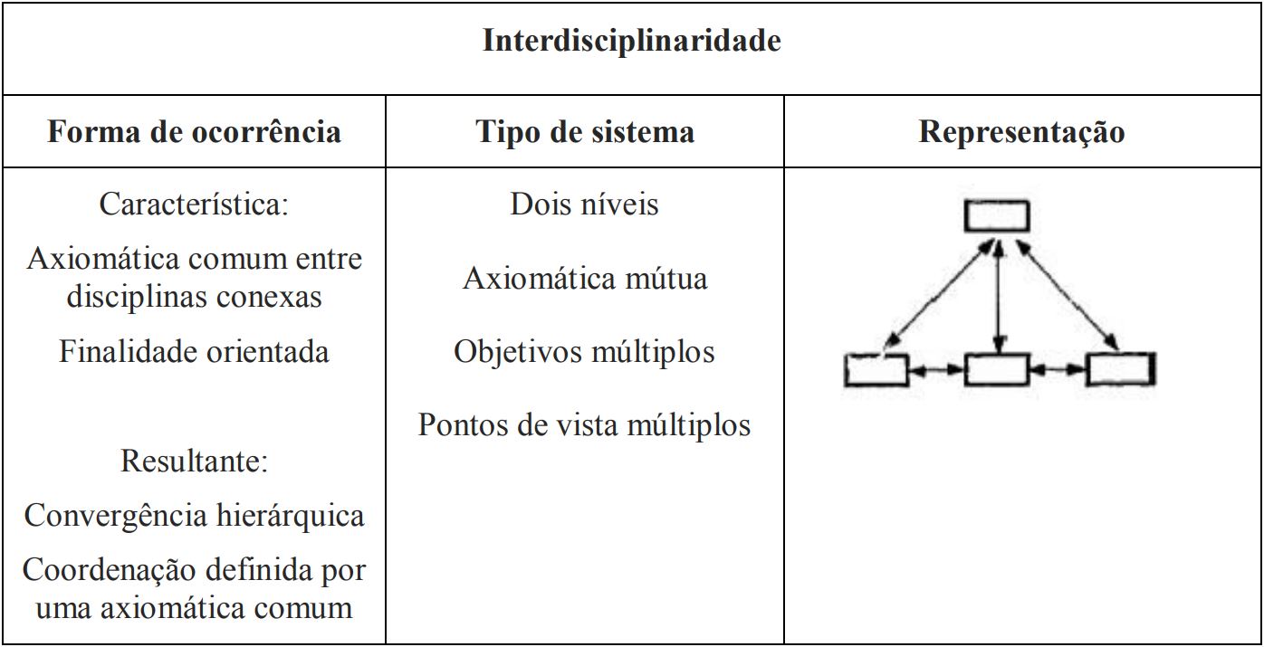Uma axiomática comum para um grupo de disciplinas relacionadas é definida no próximo nível ou sub-nível hierárquico superior, introduzindo assim um senso de propósito; a interdisciplinaridade teleológica atua entre os níveis empírico e pragmático, a interdisciplinaridade normativa entre os níveis pragmáticos e normativos, a interdisciplinaridade intencional entre os níveis normativo e proposital.[6] (JANTSCH, 1972, p. 106, tradução nossa).