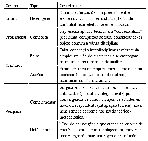[...] leva à diferenciação de pelo menos seis tipos de interdisciplinaridade. Ao mesmo tempo, esta tipologia aponta vários impulsos para a interdisciplinaridade no campo da pesquisa, no campo da prática vocacional e na complexa interação entre estes dois campos.[3]