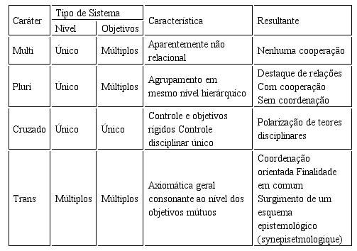 A mesma sistemática aplicada ao conceito de Interdisciplinaridade em Jantsch (1972) resulta a conformação apresentada pelo Quadro 3: