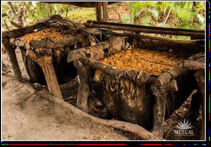 c) mezcal ancestral - en esta categoría no importa si el destilado es elaborado con maguey o de agave[14], pero la cocción sólo se puede realizar en hornos de pozo; la molienda se efectúa en batea con mazo, en tahona o en molino chileno. La fermentación implica que las piñas de agave cocidas y maceradas están en contacto con elementos naturales o pieles de animales; en este sentido no es diferente al Artesanal. La destilación es la diferencia notoria, ya que este mezcal es el que se obtiene de olla de barro con montera de barro o madera. (MÉXICO, 2017a).