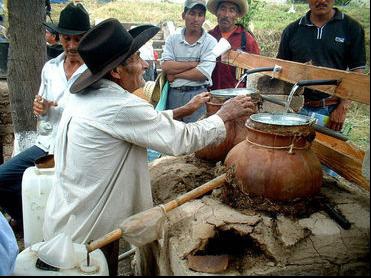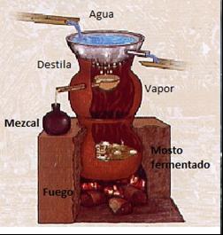 b) mezcal artesanal - es la bebida para cuyo proceso de producción no importa si la planta es maguey[12] o agave, pero la cocción es rústica (pozos de piedra, hornos de mampostería); la molienda es con mazo, tahona, en trapiche o con máquina de navajas desgarradoras. La fermentación es efectuada en oquedades de piedra, suelo o tronco, en piletas de mampostería, recipientes de madera o barro, pieles de animal, y generalmente se incluyen los sólidos (fibra o bagazo)[13]. La destilación es con fuego directo en alambiques de caldera de cobre u olla de barro y montera de barro, madera, cobre o acero inoxidable;