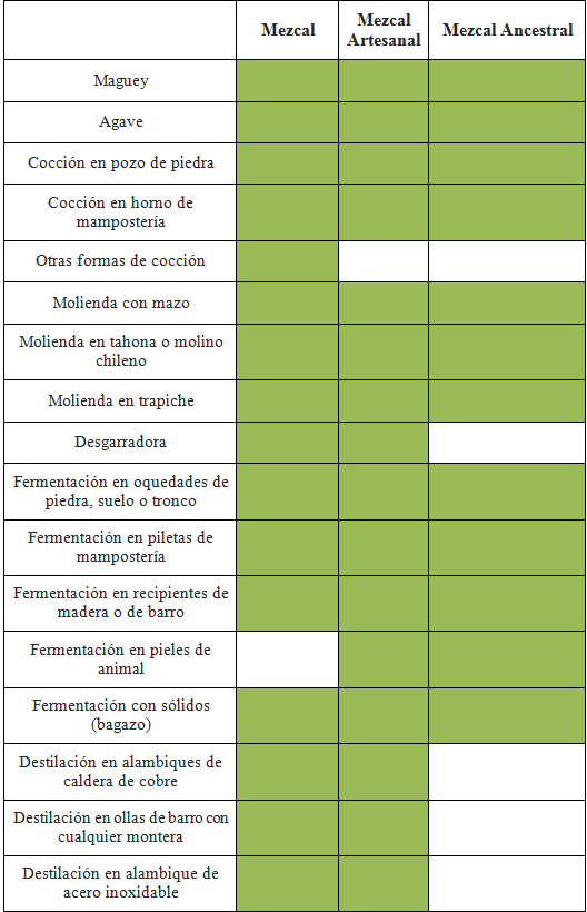 Contar con una DO implica la creación de un Consejo que regule la calidad del producto, un Pliego de Condiciones donde se especifique: la zona geográfica, los elementos que prueban el origen y propiedades del producto, la descripción del método de elaboración, entre varios más, esto es consiste en un documento que servirá de base para la confección de la Norma del producto que se protege. Ello supone, como en el caso europeo, que podrían crearse tantas DO para vinos como hubiera pliegos de condiciones que demostraran las características particulares de cada vino. Sin embargo, en México, toda la amplia gama de mezcales se está aglutinando en una sola Norma Oficial Mexicana, que en su nueva versión suaviza un poco la inevitable homogeneización de la variedad de formas de elaborar esa bebida, al reconocer que existen tres categorías de mezcales: Los artesanales, los ancestrales y los que no tienen adjetivo y que deben ser conocidos simplemente como mezcales. A continuación, se presenta una síntesis (Cuadro 2 y Fotos 1-6):
