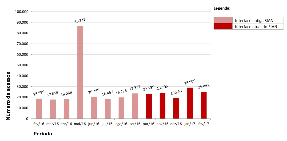Entre os meses de fevereiro de 2016 a fevereiro de 2017, o sistema teve um total de 343.021 acessos[9], importando ressaltar que nesse período houve uma mudança de interface, conforme o Gráfico 1. A nova interface entrou no ar no dia 29 de agosto de 2016, passando, a partir daí, a sofrer vários ajustes. Uma estabilização relativa no sistema quanto ao cadastramento de usuários, navegadores, recuperação de dados e etc. foi alcançada em cerca de 45 dias.
