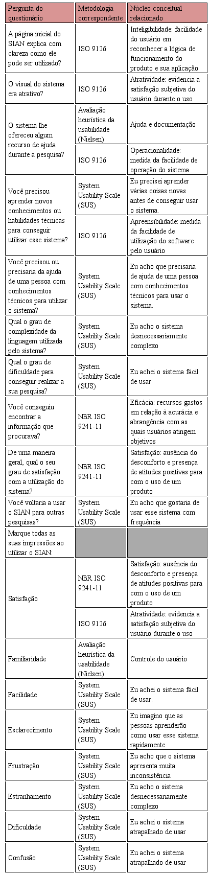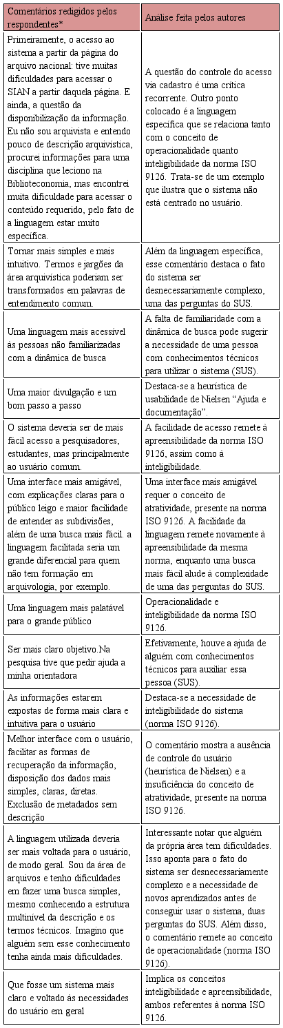 A partir da adaptação proposta, as respostas obtidas que escapavam aos critérios de avaliação do SUS foram, complementarmente, analisadas sob o prisma de duas normas técnicas relacionadas à usabilidade, a saber, ISO 9126 e NBR ISO 9241-11, ou da avaliação heurística de usabilidade proposta por Nielsen (1995).