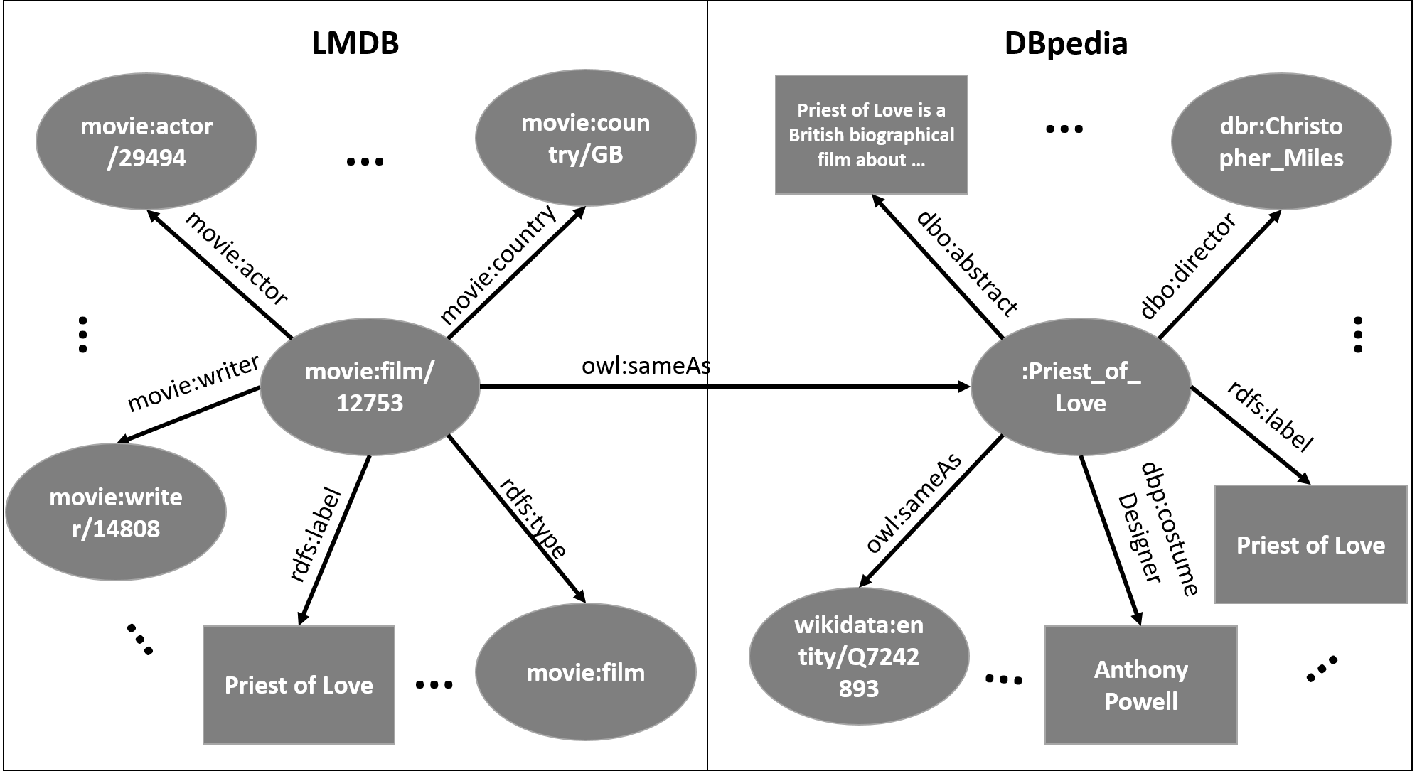 Como base de dados de audiovisuais, a Linked Movie Data Base (LMDB) destaca-se pela especificidade de dados relacionados a filmes, com informações sobre os filmes, atores, diretores, personagens, trilhas sonoras, compositores, entre outras; capaz de fornecer informações estruturadas em RDF, que auxilia quaisquer aplicações a construir e relacionar dados sobre essa temática. Outra base de dados é a DBpedia que, diferentemente da LMDB, não contém somente informações de audiovisuais, sendo uma base de domínio geral, com dados de autoridade, filmes, locais, datas, programas de televisão, entre diversas outras temáticas.