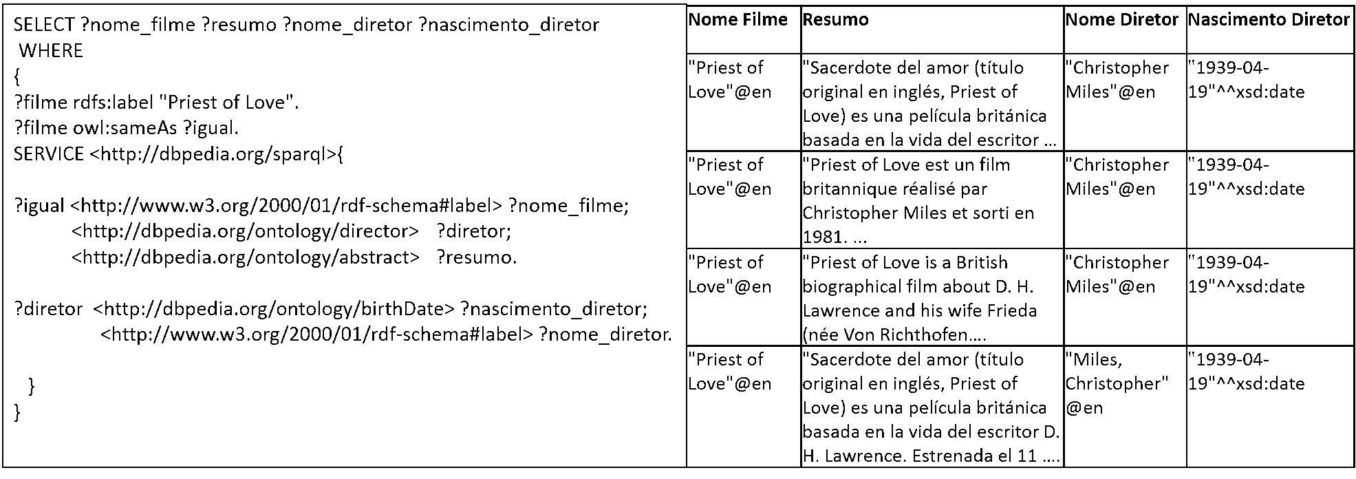 Partindo dessa relação entre os dois datasets, foi realizada a consulta federada do filme de título Priest of Love, em que a ligação entre os datasets se dava pela relação owl:sameAs, conforme demonstrado na figura 4. Desse modo, a busca localizou algumas informações disponíveis em ambas as bases de dados, por meio de uma única consulta, como demostrado pela figura 5.