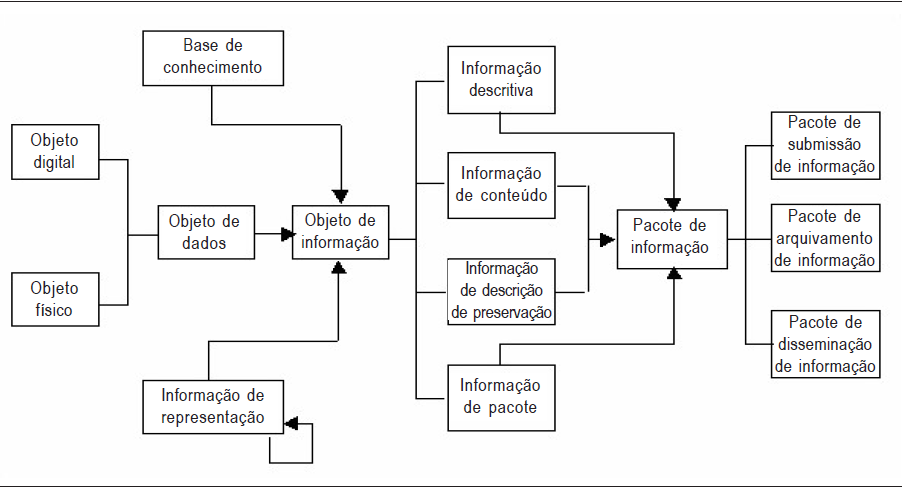 Arellano (2004) aponta que o sucesso desta etapa dependerá das soluções tecnológicas adotadas para tal e dos recursos financeiros que serão envolvidos. O autor reforça que a preservação digital é uma tarefa desafiadora, porém não impossível, desde que sejam adotadas práticas e estratégias metodológicas bem definidas. Levando-se em consideração a preservação física (foco no conteúdo armazenado em mídia), a preservação lógica (tecnologia para inserção de dados) e a preservação intelectual (foco nos mecanismos para garantir integridade e autenticidade), apontam-se o uso de métodos para esta preservação. De acordo com Arellano (2004), os métodos estruturais requerem investimentos por parte da instituição para a adoção de padrões, elaboração de normas, metadados de preservação digital e montagem de infraestrutura. Já os métodos operacionais implicam em ações aplicadas aos objetos digitais – conservação de software e hardware; migração de suporte; conversão de formatos; emulação e; preservação do conteúdo. O uso de metadados para a preservação digital permite estratégias operacionais baseadas na conservação de software e hardware, na emulação ou na migração e no gerenciamento de coleções digitais. Além do uso de metadados para o processo de tratamento de objetos digitais, tem-se ainda o modelo de referência Open Archival Information System (OAIS) que é um modelo para documentos que precisam de uma preservação digital em longo prazo. Aplicável a qualquer tipo de objeto digital, o modelo está dividido em: objeto, processo, arquivo e modificação de metadados que passam por etapas até a finalização do objeto digital para ser usado e preservado (ARELLANO, 2004). A seguir na Figura 1, apresenta-se o modelo de referência OAIS que pode ser tomado como base ou início no desenvolvimento e planejamento de tratamento de um objeto digital.