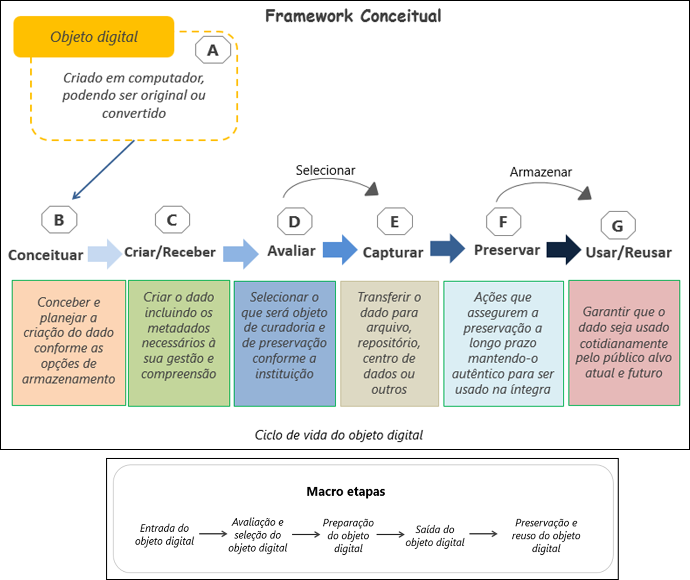 b) na avaliação e seleção do objeto digital - fazem parte dessa etapa: a avaliação e a seleção dos objetos digitais. O DCC (DATA CURATION CENTRE, 2017) aponta que passam por estes processos os objetos digitais que precisam de curadoria e preservação para serem utilizados no longo prazo e propõem a orientação documentada, políticas apropriadas, bem como o uso de requisitos de alguma forma legalizados. Pode ocorrer necessidade de reavaliação desses objetos, e, se assim for preciso, é feito o retorno do objeto digital que apresentou falha no processo de avaliação e seleção;