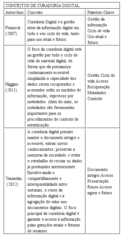 A pesquisa de Siebra, Borba e Miranda (2016) aponta que os desafios em relação à curadoria digital não são somente em termos técnicos, mas também humanos, uma vez que o processo compreende uma sustentabilidade de objetos digitais no longo prazo. A partir da análise sobre o Portfólio Bibliográfico do tema curadoria digital, com a aplicação da ferramenta Proknow-C (ver os resultados do estudo de Machado e Vianna, 2016). Além disso, foi possível identificar alguns conceitos sobre o significado da curadoria digital, ressaltando que há maior número de publicações deste tema na literatura internacional do que na literatura nacional. O Quadro 1 apresenta uma síntese dos principais conceitos encontrados.