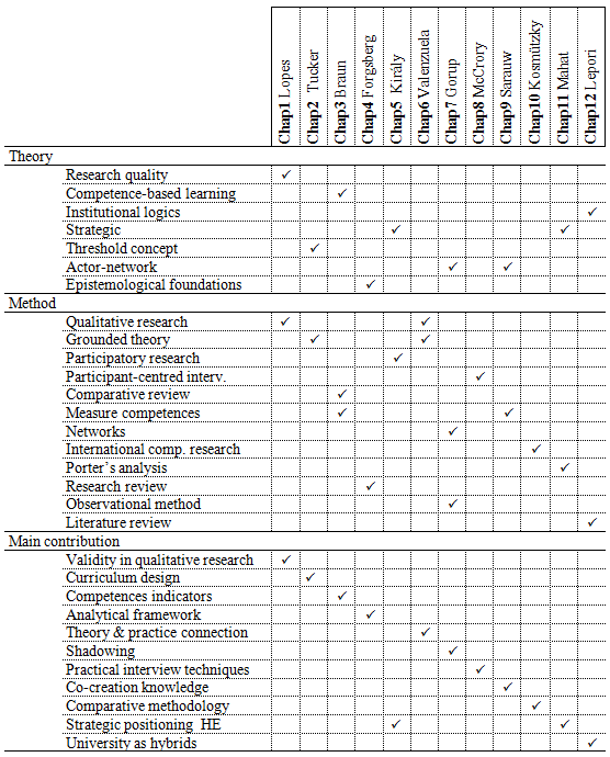 In chapter 3, Edith Braun and Shweta Mishra, from Germany, compare five approaches of assessing competences of higher education graduates: (1) self-report of competences; (2) job requirements; (3) student engagement; (4) achievement tests and (5) role plays. Their starting point is based on the idea that